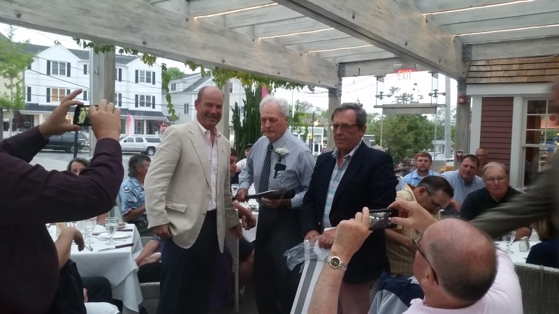 Mike Rabideau and Ron Musk present George Gaspa (center) with the Longevity Award commemorative bat